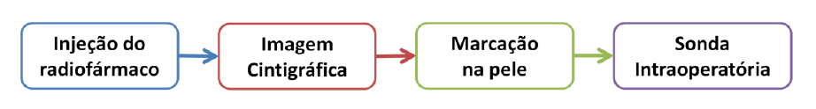 operatória do linfonodo sentinela no câncer de mama. Um pequena quantidade de material radioativo é injetado, cerca de 0,1 ml em cada ponto, e esse material percorrerá o caminho da célula desprendida do tumor primário e entrará nos ductos linfáticos até alcançar o primeiro linfonodo da cadeia.